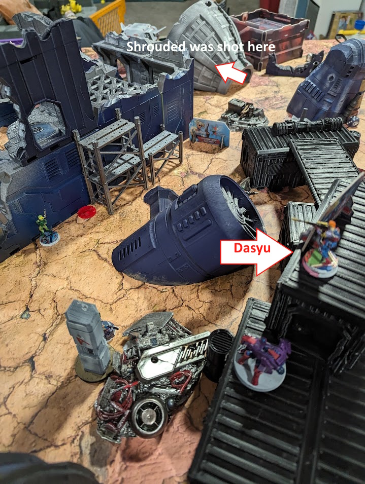 I declined to continue with that order, instead just moving out of line of sight of the Dasyu Sniper. I then made a very bad decision to try and move my Caliban up to contest the Asura (A gun fight he would have lost anyways even in a good range band), due to bad movement she caught me during a move I didn’t think she would and then she blasted my poor Caliban into teeny tiny bits. I spent the rest of my turn maneuvering my Jayth and Q drone into the mid field.